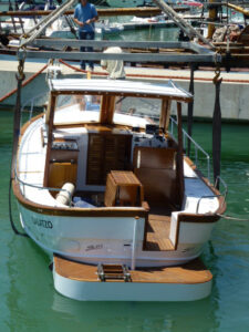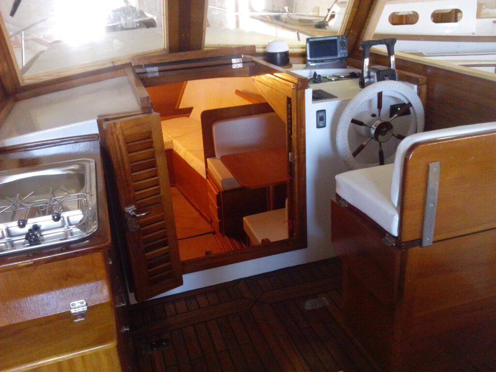 1 Baño con WC marino, lavabo y puede usarse con ducha interior con agua caliente ya que dispone de suelo de madera de Teka y motor para desagüe.