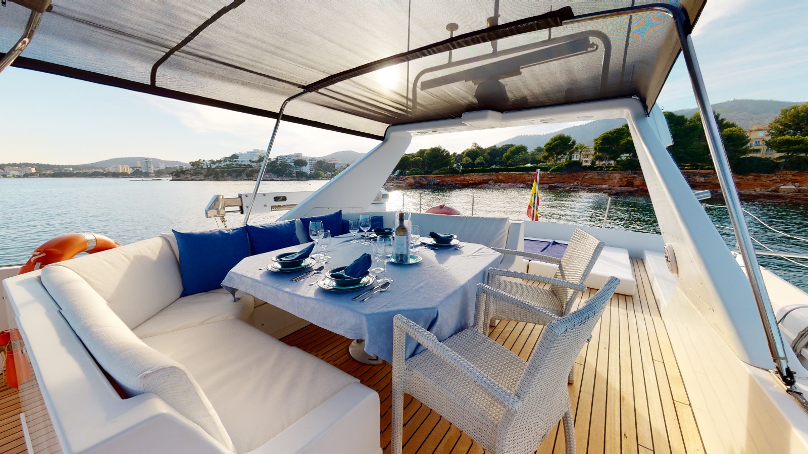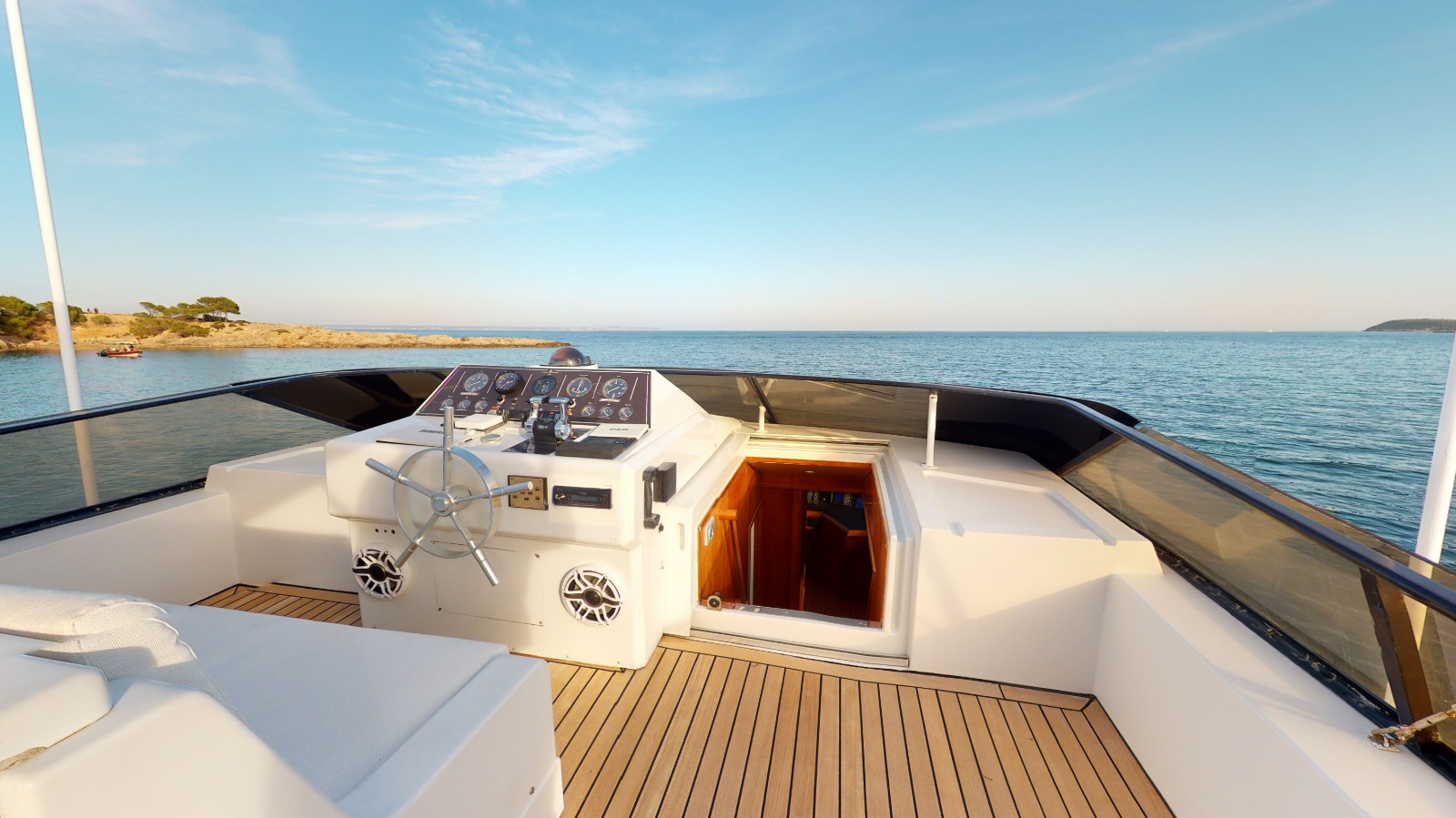 Desde el salón hay acceso al espacioso flybridge que tiene un solárium de 3 metros de ancho y espacio para que 10 personas se sienten a comer al aire libre.