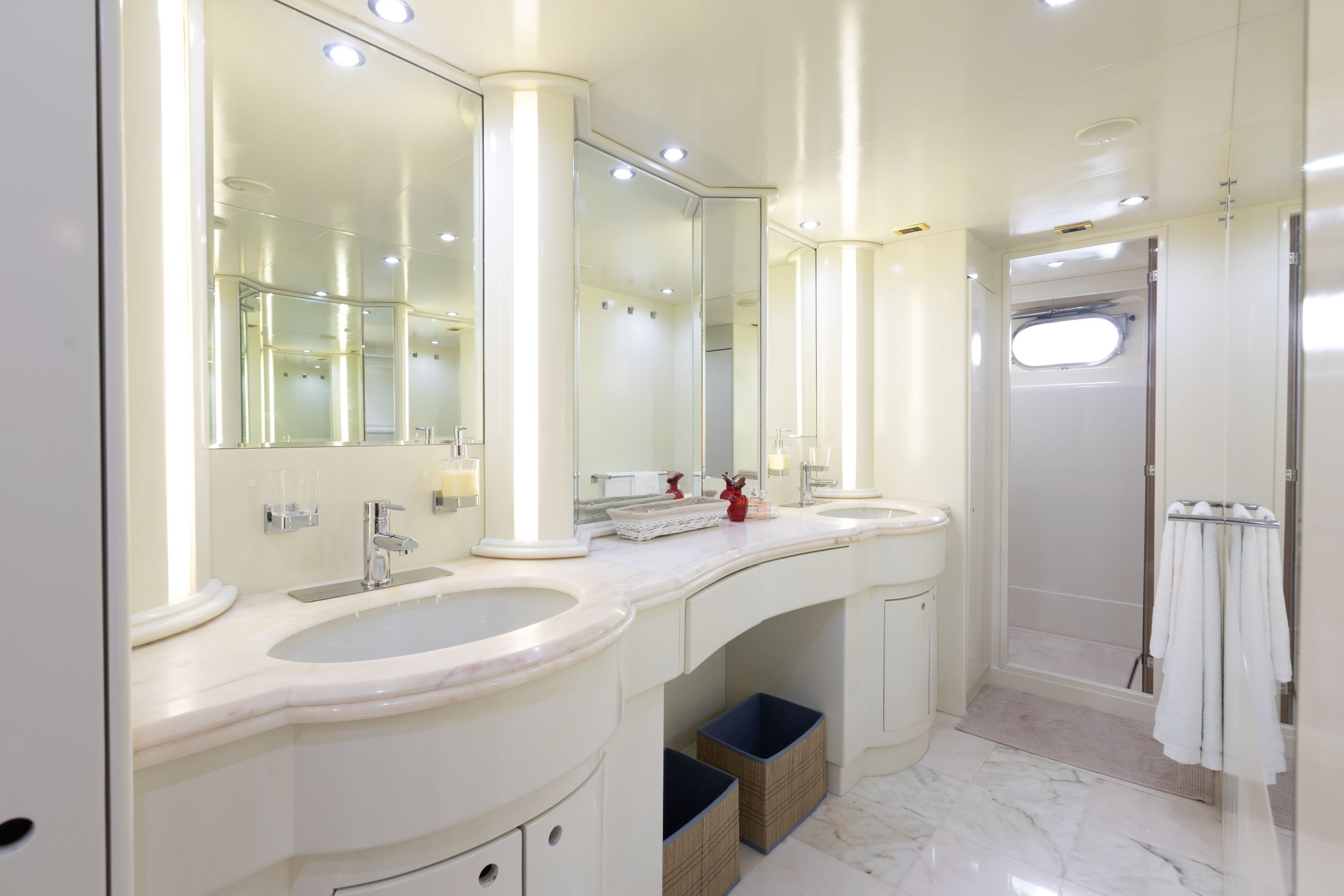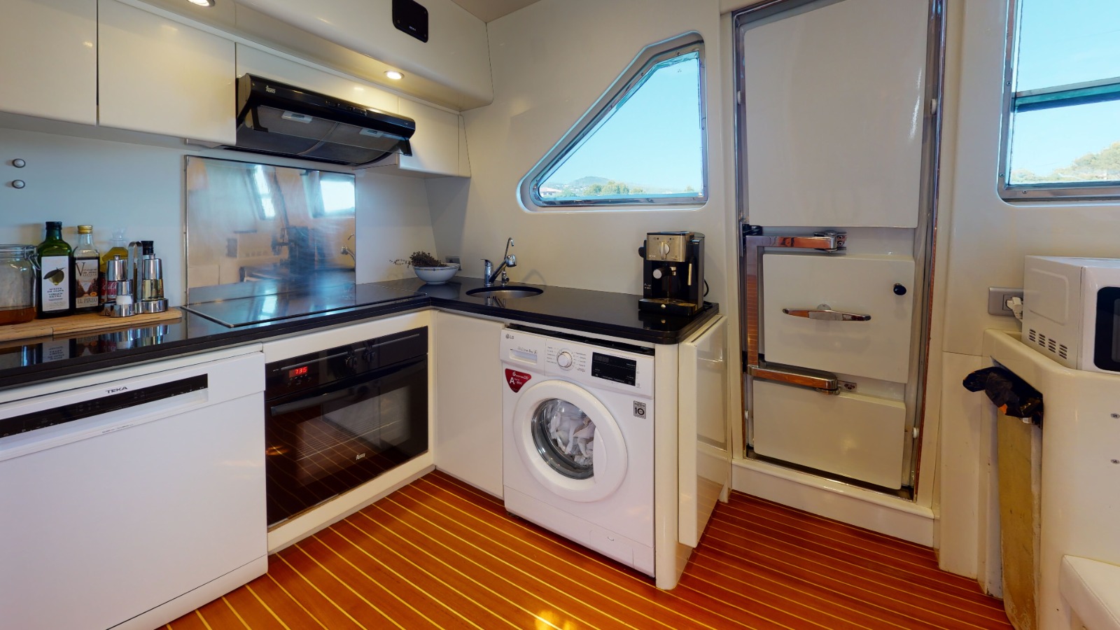 En la proa hay una zona de colchonetas para tomar el sol para 4 personas y en la popa está la plataforma de baño con escalera sumergible para nadar. En la cubierta inferior se encuentran los 4 camarotes dobles (2 king-size y 2 matrimoniales) todos con su propio baño ensuite con ducha. En la cocina totalmente equipada la tripulación preparará las comidas que decidan tomar a bordo.